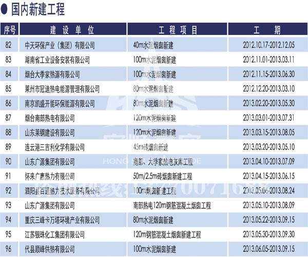 • 煙囪新建宏順建設工程有限公司是一家專業從事煙囪新建,煙囪防腐,煙囪內壁防腐,煙囪脫硫防腐,磚煙囪新建,水泥煙囪新建,鋼煙囪新建,水泥煙囪防腐,混凝土煙囪新建,煙囪拆除,煙囪維修,煙囪脫硫防腐等工程!咨詢熱線:13770071688。